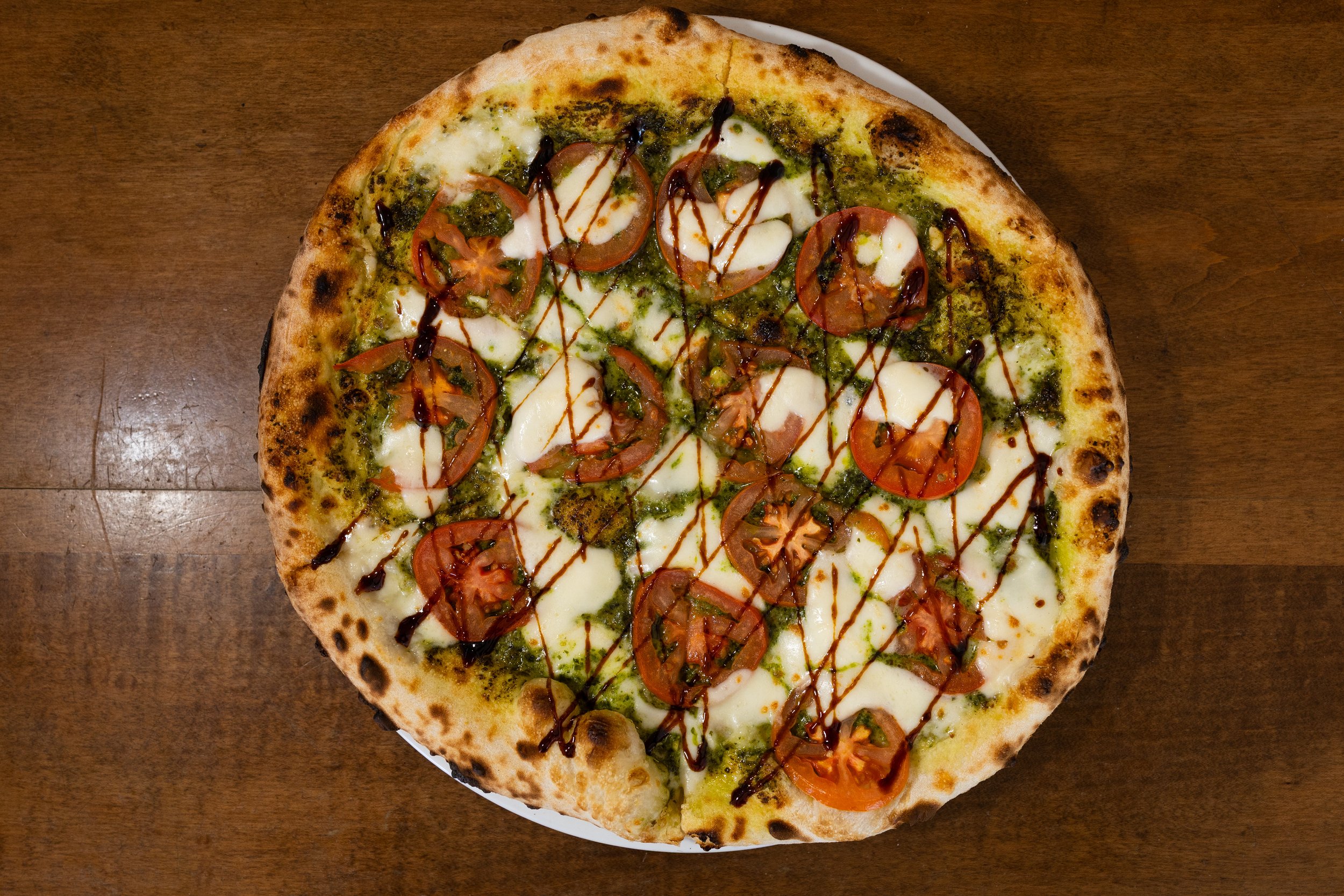 Nut-free basil pesto topped with fresh mozzarella, fresh tomatoes and balsamic reduction.